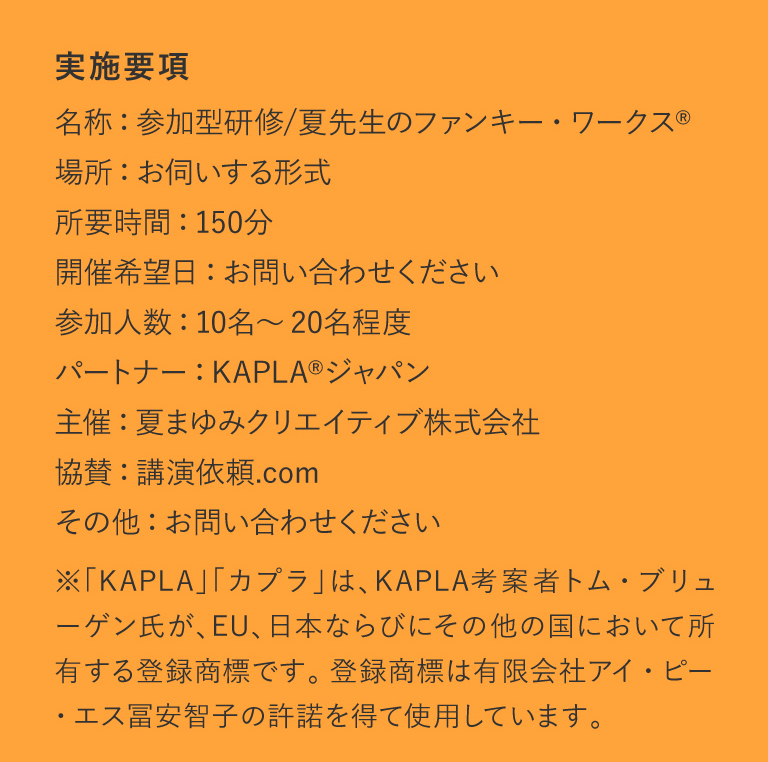 • このカリキュラムは NHK「助けて!きわめびと」でも放送され、多くの視聴者のご賛同をいただいてきました。 研修でご使用いただくKAPLAは、終了後お持ち帰りください。使用商品:KAPLA ブロック100